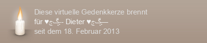 Wir haben uns gesucht ~ und wir haben uns gefunden. Ich hab dich die schlimmsten Monate deines Lebens Tag und Nacht begleitet. Wir haben gemeinsam gekämpft …. Du so tapfer warst und so duldsam... aber der Krebs hat gesiegt und du musstest viel zu früh von mir gehen. Dieter; nie wirst Du vergessen sein, Du bist in meinen Armen gestorben. Du stehst in Gedanken immer noch vor mir und ich bin immer noch stolz auf Dich, mein tapferer Schatz!