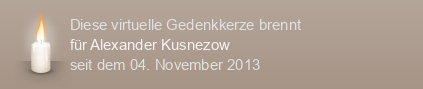 Am 04.11.2013 wurde diese virtuelle Gedenkkerze für Alexander Kusnezow auf Kerze-anzuenden.de entzündet und damit ein einzigartiges Online-Gedenken erstellt.