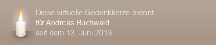 Am 13.06.2013 wurde diese virtuelle Gedenkkerze für Andreas Buchwald (im Tierkreiszeichen Wassermann geboren) auf Kerze-anzuenden.de entzündet und damit ein einzigartiges Online-Gedenken erstellt.