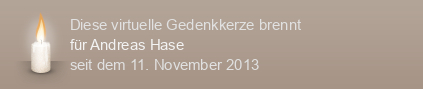 Am 11.11.2013 wurde diese virtuelle Gedenkkerze für Andreas Hase (im Tierkreiszeichen Widder geboren) auf Kerze-anzuenden.de entzündet und damit ein einzigartiges Online-Gedenken erstellt.