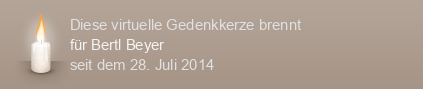Am 28.07.2014 wurde diese virtuelle Gedenkkerze für Bertl Beyer (im Tierkreiszeichen Stier geboren) auf Kerze-anzuenden.de entzündet und damit ein einzigartiges Online-Gedenken erstellt.