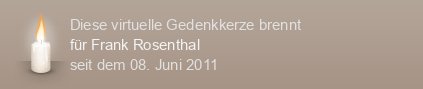 Mein Lieber Frank. Ich vermisse dich so sehr.Warum mustest du gerade gehen,mir ist als wäre es gestern gewesen.Du warst doch viel zu jung,wir waren doch erst 6 jahre zusammen.Ich kann es nicht begreifen,heute ist wieder ein schlimmer tag wo ich dich sehr vermisse.rnRuhe in frieden,Eine Kerze als zeichen meiner Liebe.Deine Karin