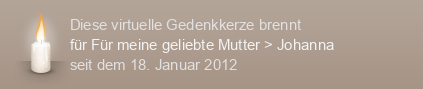 Diese Kerze ist zum 73. Geburtstag meiner geliebten Mutter. Was würde ich drum geben dich noch einmal ganz feste in meine Armen halten zu dürfen. Ich vermisse dich soo sehr. Du warst die beste Mama dieser Welt. Es kommt der Tag da werden wir uns alle wieder sehen. Grüss Papa und meine Schwester schön von mir. Ich liebe dich, deine Tochter Waltraud...