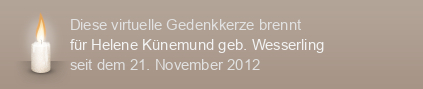 Am 21.11.2012 wurde diese virtuelle Gedenkkerze für Helene Künemund geb. Wesserling (im Tierkreiszeichen Löwe geboren) auf Kerze-anzuenden.de entzündet und damit ein einzigartiges Online-Gedenken erstellt.