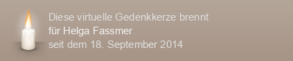 Am 18.09.2014 wurde diese virtuelle Gedenkkerze für Helga Fassmer (im Tierkreiszeichen Jungfrau geboren) auf Kerze-anzuenden.de entzündet und damit ein einzigartiges Online-Gedenken erstellt.