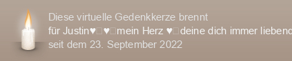 Am 23.09.2022 wurde diese virtuelle Gedenkkerze für Justin♥️♥️mein Herz ♥️deine dich immer liebende Mama ♥️ (im Tierkreiszeichen Skorpion geboren) auf Kerze-anzuenden.de entzündet und damit ein einzigartiges Online-Gedenken erstellt.
