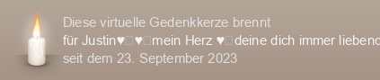 Am 23.09.2023 wurde diese virtuelle Gedenkkerze für Justin♥️♥️mein Herz ♥️deine dich immer liebende Mama ♥️ (im Tierkreiszeichen Skorpion geboren) auf Kerze-anzuenden.de entzündet und damit ein einzigartiges Online-Gedenken erstellt.