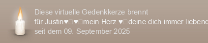 Am 09.09.2025 wurde diese virtuelle Gedenkkerze für Justin♥️♥️mein Herz ♥️deine dich immer liebende Mama ♥️ (im Tierkreiszeichen Skorpion geboren) auf Kerze-anzuenden.de entzündet und damit ein einzigartiges Online-Gedenken erstellt.
