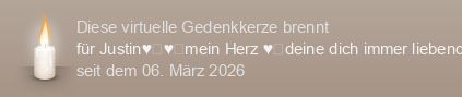 Am 06.03.2026 wurde diese virtuelle Gedenkkerze für Justin♥️♥️mein Herz ♥️deine dich immer liebende Mama ♥️ (im Tierkreiszeichen Skorpion geboren) auf Kerze-anzuenden.de entzündet und damit ein einzigartiges Online-Gedenken erstellt.