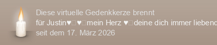 Am 17.03.2026 wurde diese virtuelle Gedenkkerze für Justin♥️♥️mein Herz ♥️deine dich immer liebende Mama ♥️ (im Tierkreiszeichen Skorpion geboren) auf Kerze-anzuenden.de entzündet und damit ein einzigartiges Online-Gedenken erstellt.