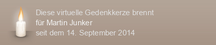 Am 14.09.2014 wurde diese virtuelle Gedenkkerze für Martin Junker (im Tierkreiszeichen Jungfrau geboren) auf Kerze-anzuenden.de entzündet und damit ein einzigartiges Online-Gedenken erstellt.