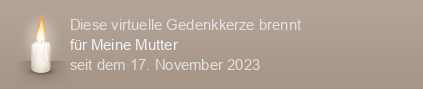 Am 17.11.2023 wurde diese virtuelle Gedenkkerze für Meine Mutter auf Kerze-anzuenden.de entzündet und damit ein einzigartiges Online-Gedenken erstellt.