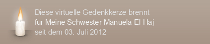 Am 03.07.2012 wurde diese virtuelle Gedenkkerze für Meine Schwester Manuela El-Haj (im Tierkreiszeichen Löwe geboren) auf Kerze-anzuenden.de entzündet und damit ein einzigartiges Online-Gedenken erstellt.