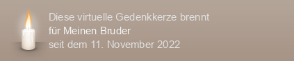 Am 11.11.2022 wurde diese virtuelle Gedenkkerze für Meinen Bruder auf Kerze-anzuenden.de entzündet und damit ein einzigartiges Online-Gedenken erstellt.