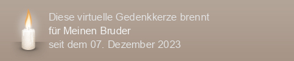 Am 07.12.2023 wurde diese virtuelle Gedenkkerze für Meinen Bruder auf Kerze-anzuenden.de entzündet und damit ein einzigartiges Online-Gedenken erstellt.
