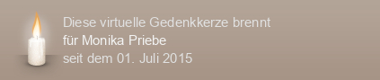 Am 01.07.2015 wurde diese virtuelle Gedenkkerze für Monika Priebe auf Kerze-anzuenden.de entzündet und damit ein einzigartiges Online-Gedenken erstellt.