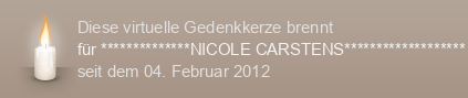 Am 04.02.2012 wurde diese virtuelle Gedenkkerze für **************NICOLE CARSTENS******************* auf Kerze-anzuenden.de entzündet und damit ein einzigartiges Online-Gedenken erstellt.