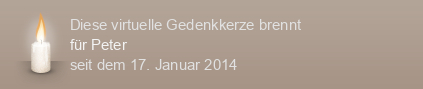 Am 17.01.2014 wurde diese virtuelle Gedenkkerze für Peter auf Kerze-anzuenden.de entzündet und damit ein einzigartiges Online-Gedenken erstellt.