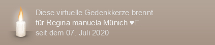 Am 07.07.2020 wurde diese virtuelle Gedenkkerze für Regina manuela Münich ♥️ auf Kerze-anzuenden.de entzündet und damit ein einzigartiges Online-Gedenken erstellt.