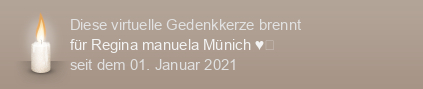 Am 01.01.2021 wurde diese virtuelle Gedenkkerze für Regina manuela Münich ♥️ auf Kerze-anzuenden.de entzündet und damit ein einzigartiges Online-Gedenken erstellt.