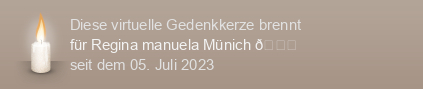 Am 05.07.2023 wurde diese virtuelle Gedenkkerze für Regina manuela Münich 💏 auf Kerze-anzuenden.de entzündet und damit ein einzigartiges Online-Gedenken erstellt.