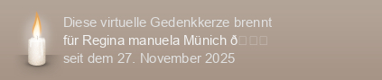 Am 27.11.2025 wurde diese virtuelle Gedenkkerze für Regina manuela Münich 💏 (im Tierkreiszeichen Krebs geboren) auf Kerze-anzuenden.de entzündet und damit ein einzigartiges Online-Gedenken erstellt.