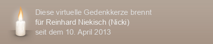 Am 10.04.2013 wurde diese virtuelle Gedenkkerze für Reinhard Niekisch (Nicki) (im Tierkreiszeichen Steinbock geboren) auf Kerze-anzuenden.de entzündet und damit ein einzigartiges Online-Gedenken erstellt.