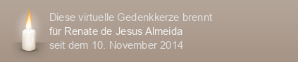 Am 10.11.2014 wurde diese virtuelle Gedenkkerze für Renate de Jesus Almeida (im Tierkreiszeichen Wassermann geboren) auf Kerze-anzuenden.de entzündet und damit ein einzigartiges Online-Gedenken erstellt.