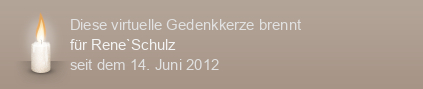 Am 14.06.2012 wurde diese virtuelle Gedenkkerze für Rene`Schulz (im Tierkreiszeichen Löwe geboren) auf Kerze-anzuenden.de entzündet und damit ein einzigartiges Online-Gedenken erstellt.