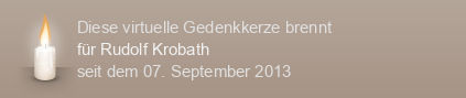Am 07.09.2013 wurde diese virtuelle Gedenkkerze für Rudolf Krobath (im Tierkreiszeichen Skorpion geboren) auf Kerze-anzuenden.de entzündet und damit ein einzigartiges Online-Gedenken erstellt.
