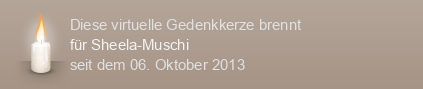 Am 06.10.2013 wurde diese virtuelle Gedenkkerze für Sheela-Muschi (im Tierkreiszeichen Stier geboren) auf Kerze-anzuenden.de entzündet und damit ein einzigartiges Online-Gedenken erstellt.