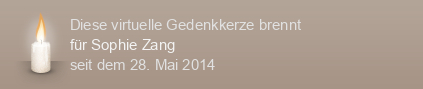 Am 28.05.2014 wurde diese virtuelle Gedenkkerze für Sophie Zang (im Tierkreiszeichen Stier geboren) auf Kerze-anzuenden.de entzündet und damit ein einzigartiges Online-Gedenken erstellt.