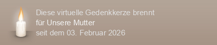 Am 03.02.2026 wurde diese virtuelle Gedenkkerze für Unsere Mutter (im Tierkreiszeichen Wassermann geboren) auf Kerze-anzuenden.de entzündet und damit ein einzigartiges Online-Gedenken erstellt.