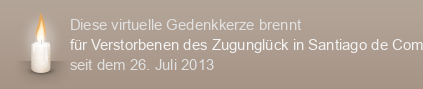Am 26.07.2013 wurde diese virtuelle Gedenkkerze für Verstorbenen des Zugunglück in Santiago de Compostela auf Kerze-anzuenden.de entzündet und damit ein einzigartiges Online-Gedenken erstellt.