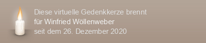 Am 26.12.2020 wurde diese virtuelle Gedenkkerze für Winfried Wöllenweber (im Tierkreiszeichen Schütze geboren) auf Kerze-anzuenden.de entzündet und damit ein einzigartiges Online-Gedenken erstellt.