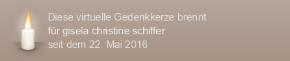 Am 22.05.2016 wurde diese virtuelle Gedenkkerze für gisela christine schiffer (im Tierkreiszeichen Krebs geboren) auf Kerze-anzuenden.de entzündet und damit ein einzigartiges Online-Gedenken erstellt.