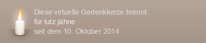 Am 10.10.2014 wurde diese virtuelle Gedenkkerze für lutz jähne (im Tierkreiszeichen Jungfrau geboren) auf Kerze-anzuenden.de entzündet und damit ein einzigartiges Online-Gedenken erstellt.
