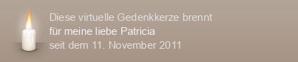 Am 11.11.2011 wurde diese virtuelle Gedenkkerze für meine liebe Patricia (im Tierkreiszeichen Waage geboren) auf Kerze-anzuenden.de entzündet und damit ein einzigartiges Online-Gedenken erstellt.