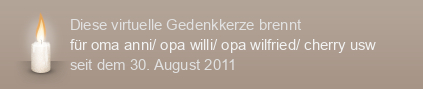 Am 30.08.2011 wurde diese virtuelle Gedenkkerze für oma anni/ opa willi/ opa wilfried/ cherry usw auf Kerze-anzuenden.de entzündet und damit ein einzigartiges Online-Gedenken erstellt.