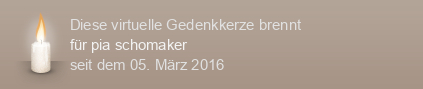 Am 05.03.2016 wurde diese virtuelle Gedenkkerze für pia schomaker (im Tierkreiszeichen Fische geboren) auf Kerze-anzuenden.de entzündet und damit ein einzigartiges Online-Gedenken erstellt.